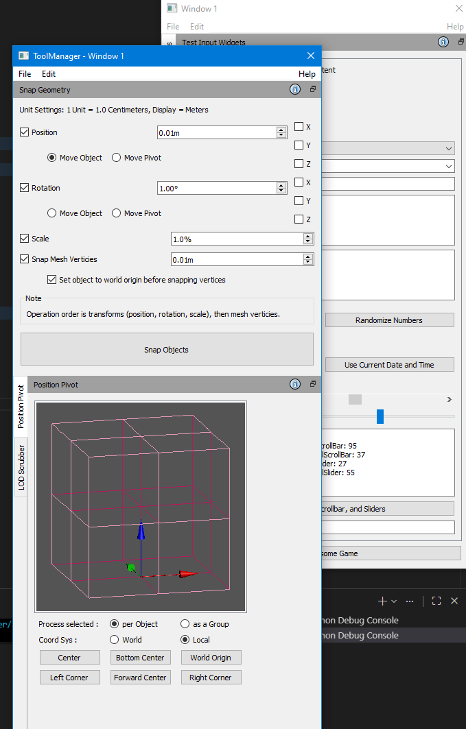- Settings are also handled automatically and stored in the user’s ‘My Documents’ area for ease of management (Had one incident where a tool was saving its settings into the Perforce project directory). It can automatically save and restore settings for some recognized input widgets as well.