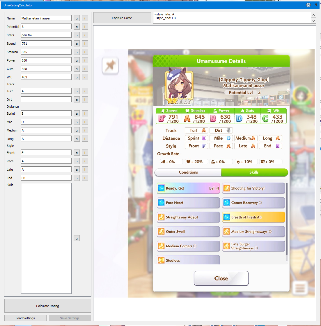 Captures the running game of a Umamusume’s stats page during a career run to calculate it’s rating. For calculating when to stop for a B-rating veteran for the Champion Meet.